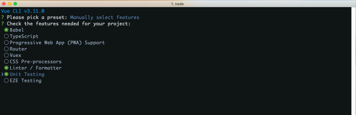In this step we will select Unit Testing to add the appropriate libraries to our project. TIP: You can use your arrows to move up and down and then press the spacebar when you want to select/deselect a feature.