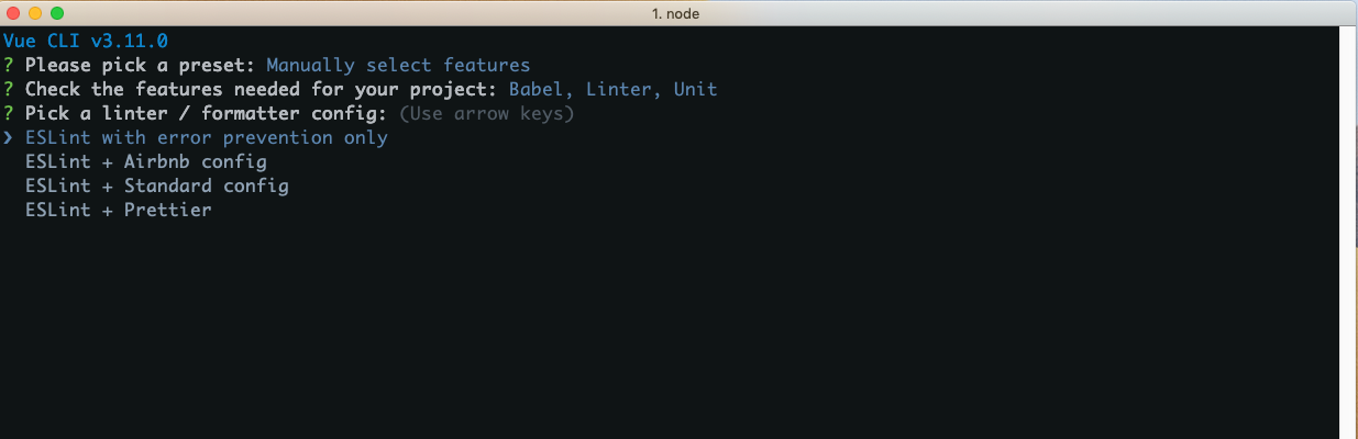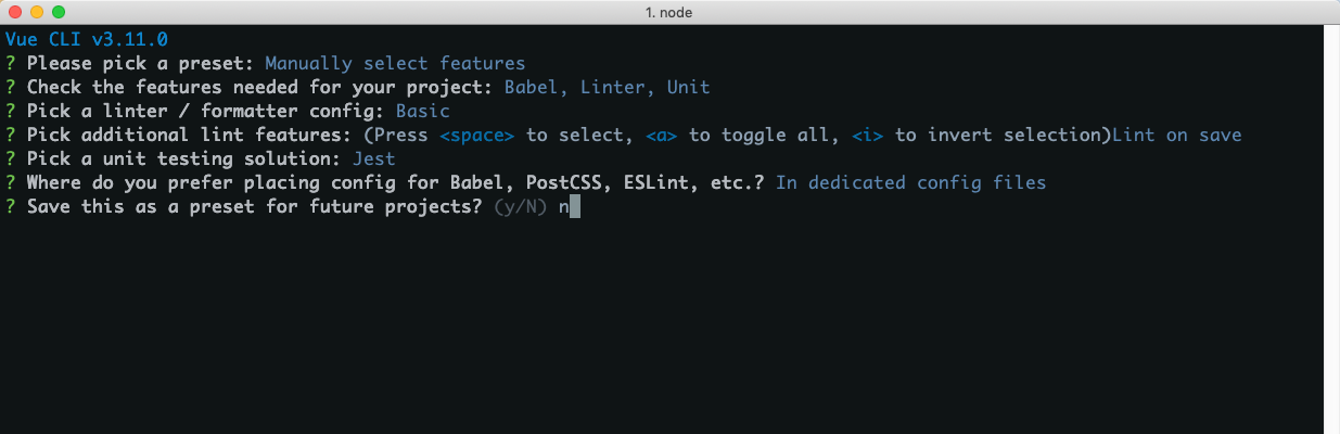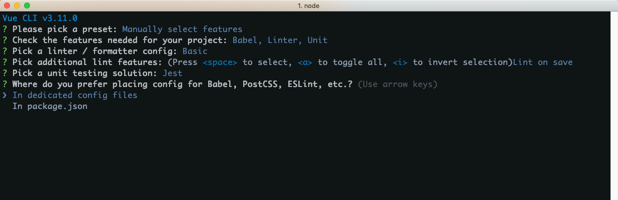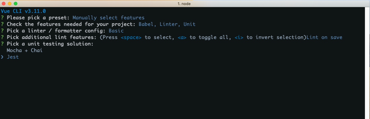 Because we selected Unit Testing as a feature to include in our project, this step is asking us what library we want to use for Unit Testing. We are going to use Jest.