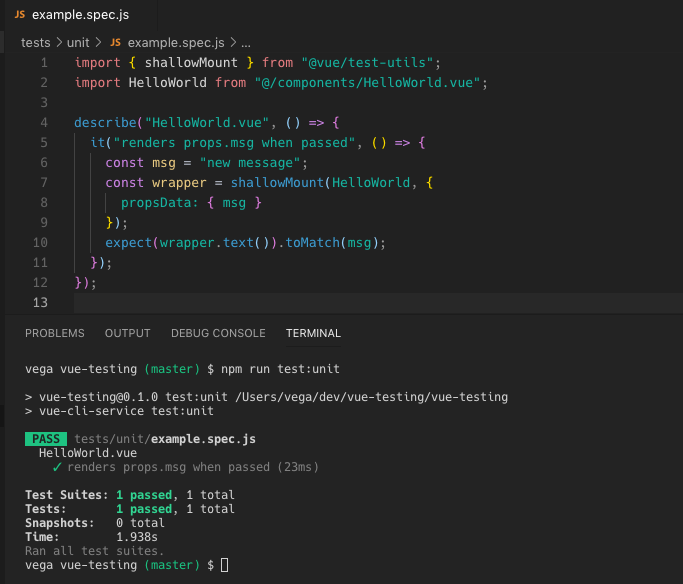 When we selected Jest as our testing library, the Vue CLI created a sample test /test/unit/example.spec.js for us. This tests the /src/components/HelloWorld.vue component that was also created for us by the Vue CLI . After we are done running this test as an example, we are going to delete it and focus on writing our own tests.