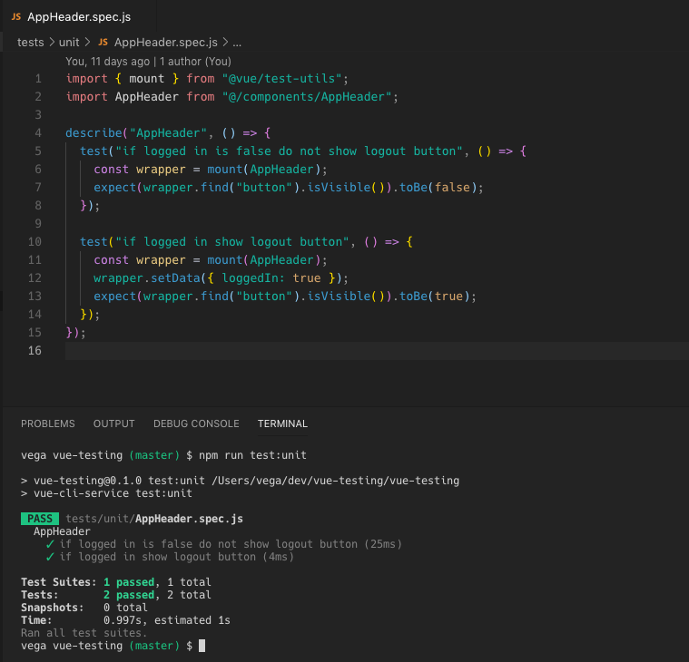 You just wrote your very first tests, nice job! Now that you have your tests written it’s time to run them and verify that they work. To run your tests you can use the command npm run test:unit from the command line. You should see a similar output to the one below, with two tests passing.